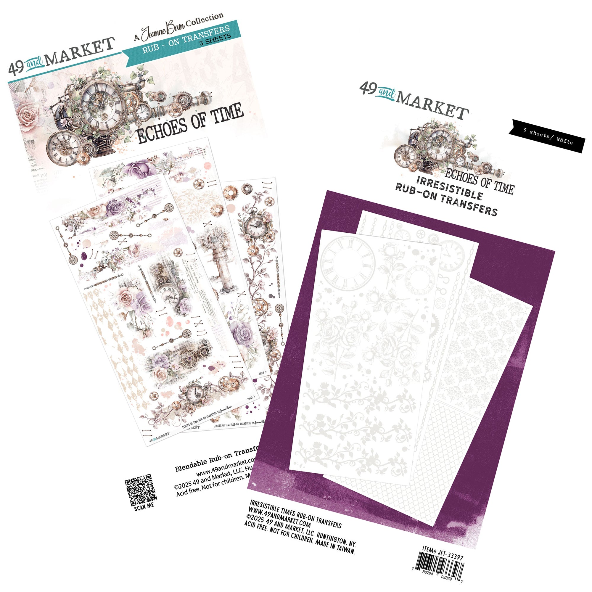 Transport your projects to a bygone era with the Echoes of Time rub-on transfers. Each beautifully intricate set features a rich tapestry of dangling timepieces, delicate florals, and industrial cogs, all woven together with stunning textures. Whether you're a scrapbooker, mixed-media artist, or crafter, these transfers are perfect for adding a touch of vintage elegance and a sense of history to your creations. 3 sheets per set. Available in multiple styles, each sold separately.