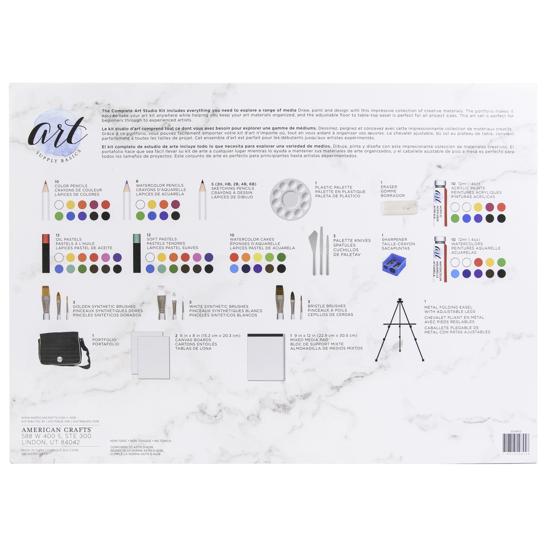 This complete art studio kit includes everything you need to explore a range of media. Draw, paint and design with this impressive collection of 97 creative materials. This art set is perfect for beginners through to experienced artists. This 23.25x16.5x5 inch package contains ten color pencils, eight watercolor pencils, five sketching pencils, one plastic palette, one eraser, ten 12ml tubes of acrylic paints, 12 oil pastels, 12 soft pastels, ten watercolor cakes, three palette knives, one sharpener, ten 12ml tubes of watercolors, three golden synthetic brushes, three white synthetic brushes, three bristle brushes, one portfolio, three 6x8 inch canvas boards, one 9x12 inch mixed media pad and one metal folding easel. Non-toxic. Conforms to ASTM D 4236. Imported.