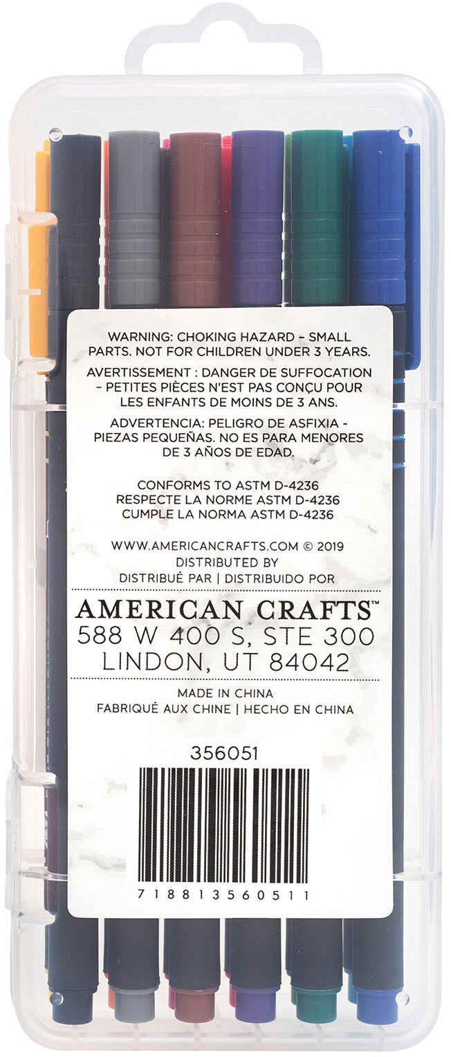 These pens are perfect for handwriting, calligraphy, sketching and more! This 3x6.75x1 inch package contains 12 .4mm fine tip pens in assorted colors. Conforms to ASTM D 4236. WARNING: Choking Hazard- small parts. Not for children under 3 years. Imported.