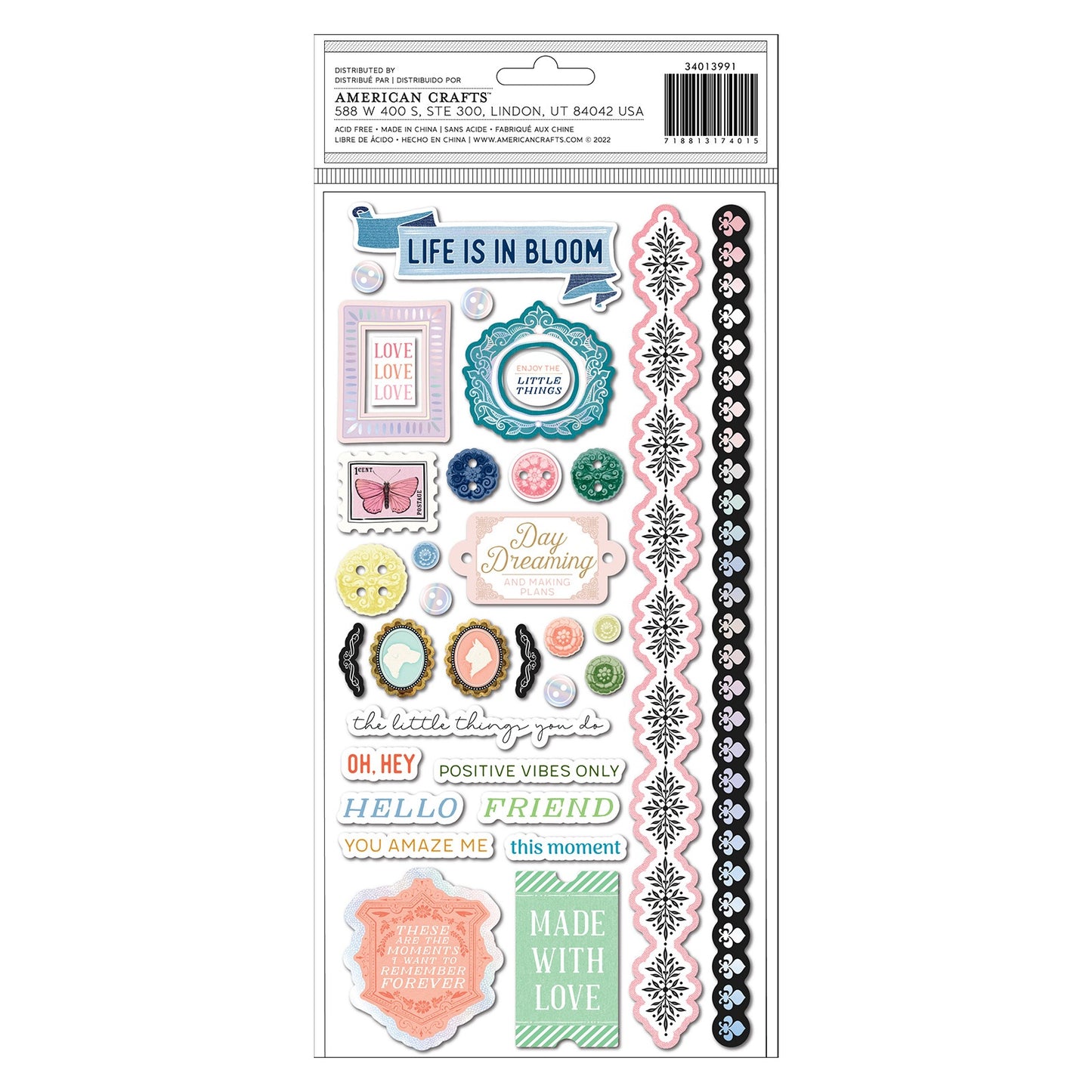 Thickers are the perfect finishing touch! Their thick material adds the perfect amount of dimension to just about anything. Try them on scrapbooks, cards, home decor, and much more. This package includes over Thickers phrases and embellishments, some with a shiny iridescent foil finish. Perfect for scrapbooking, card making, DIY projects, and home decor. Iridescent foil accents add an elegant and eye-catching shine to just about any project. Great for embellishing or for keeping photos and notes in place. Pair with other coordinating BoBunny products for beautiful projects in no time. This package contains 68 Thickers phrases and embellishments. Imported.