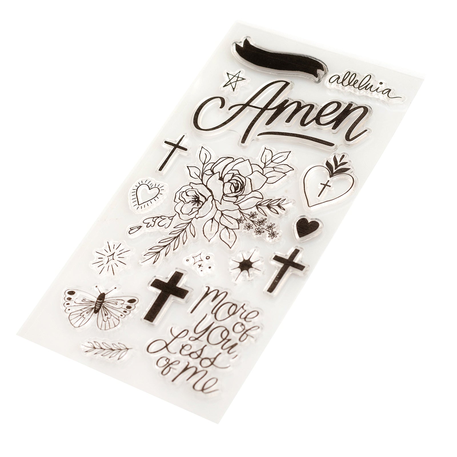 Stamp your favorite phrases right onto your Bible pages with this acrylic stamp set. Choose colored inks and personalize your pages with these uplifting sayings. This package includes 17 acrylic stamps in a variety of sayings and symbols. Imported.