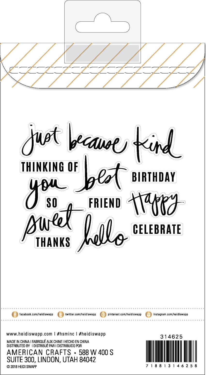 From Just Because to Celebrate, this Sentiments stamp set from Heidi Swapp will spark your creativity once you open the package. These clear stamps are to be used with an acrylic block (sold separately). Great for card making, scrapbooking, journals, planners, note cards, and other mixed media projects. This includes 14 stamps. Imported.