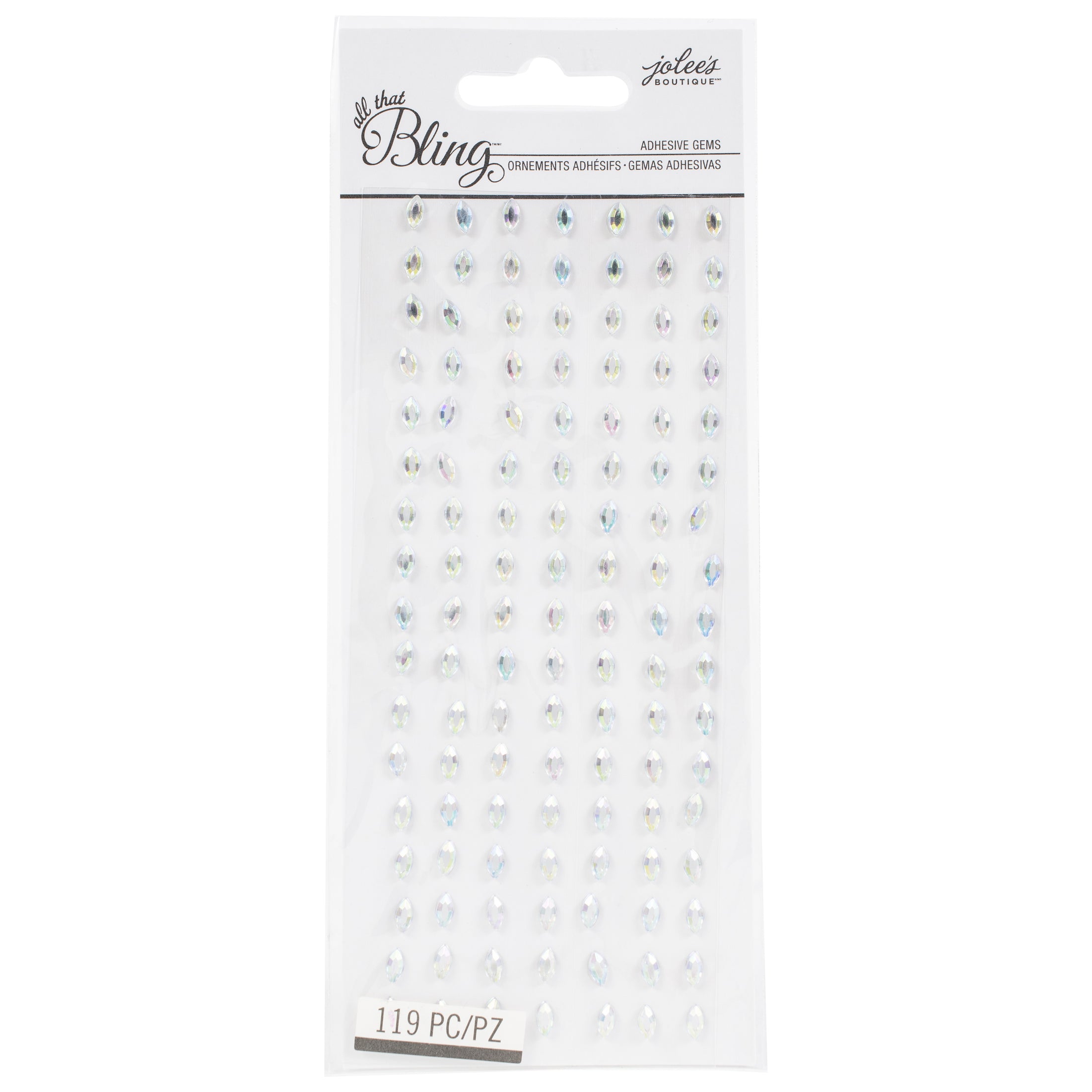 These delightful marquise-shaped gem embellishments are the perfect finishing touch to any craft! These Horse Eye gems from Jolee's Boutique come in an iridescent finish that adds interest to your next project. This package contains 119 embellishments on one 2.5x5.75 inch backing sheet. Imported.