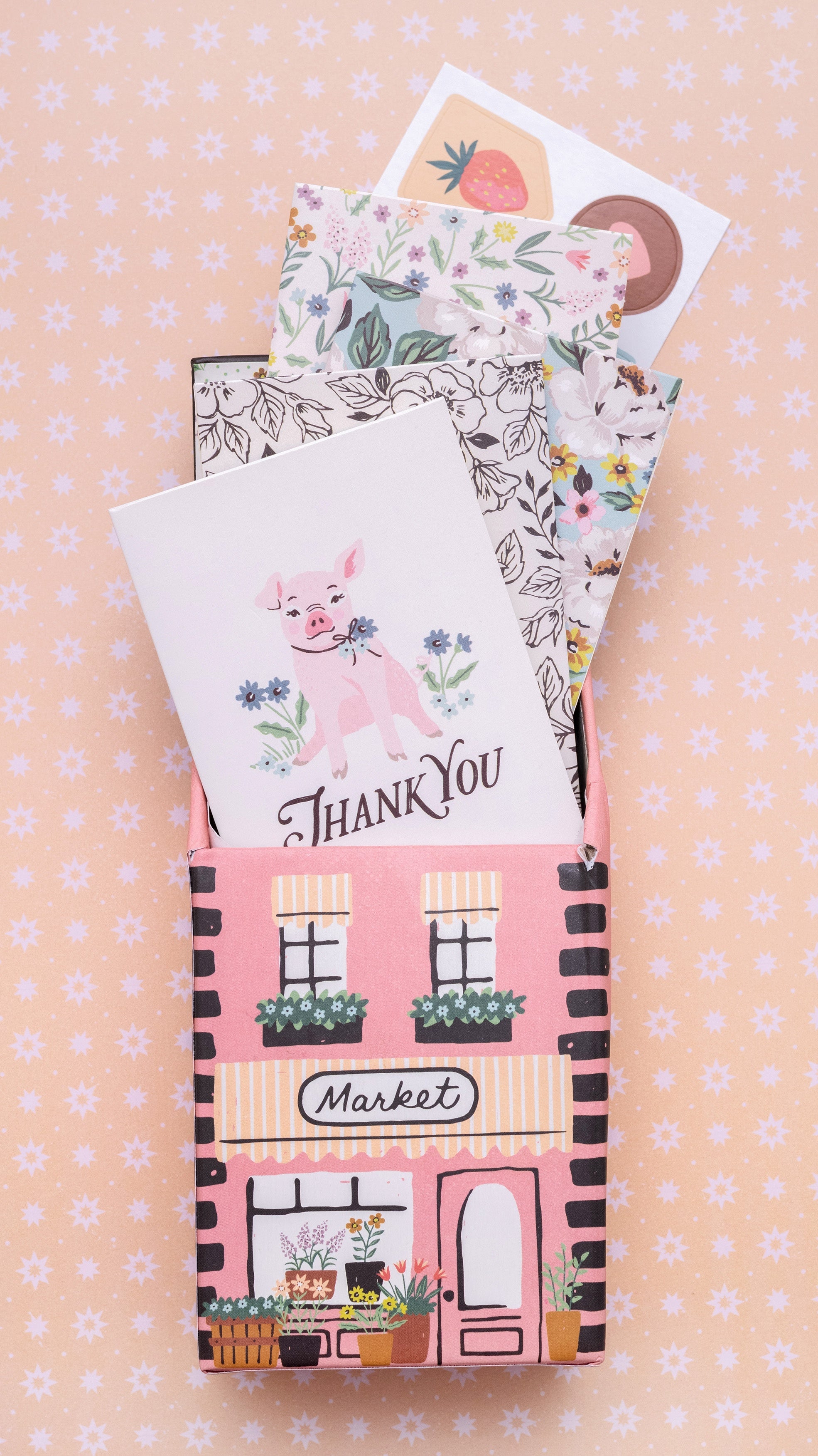 Spread some joy by giving these mini cards to your friends and family. This kit includes 12 mini cards and envelopes. This includes 37 pieces total; 6 stickers, 3 banners and 3 circles with images used in this collection. The mini cards include 3 flower patterns used in this collection and one with the cute pig and the phrase Thank You. There are 3 each of 4 designs. Imported.