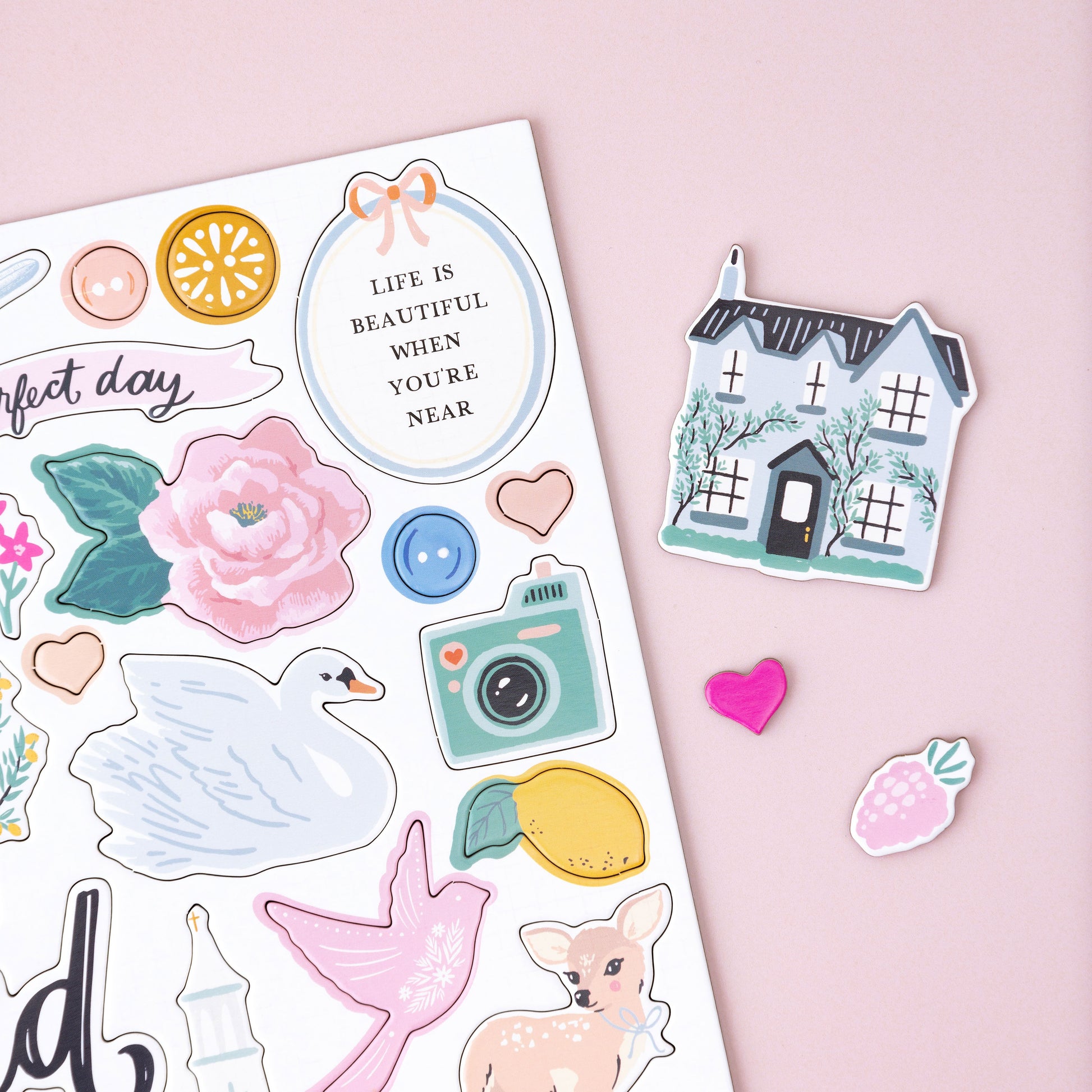 Stickers add the perfect finishing touch to your paper projects. Stickers can be a fun embellishment, a whimsical accent or add elegant polish to scrapbook pages, greeting cards, mixed media and more. This package contains Maggie Holmes Parasol Chipboard Stickers - Icons & Phrase, 61 stickers. Imported.