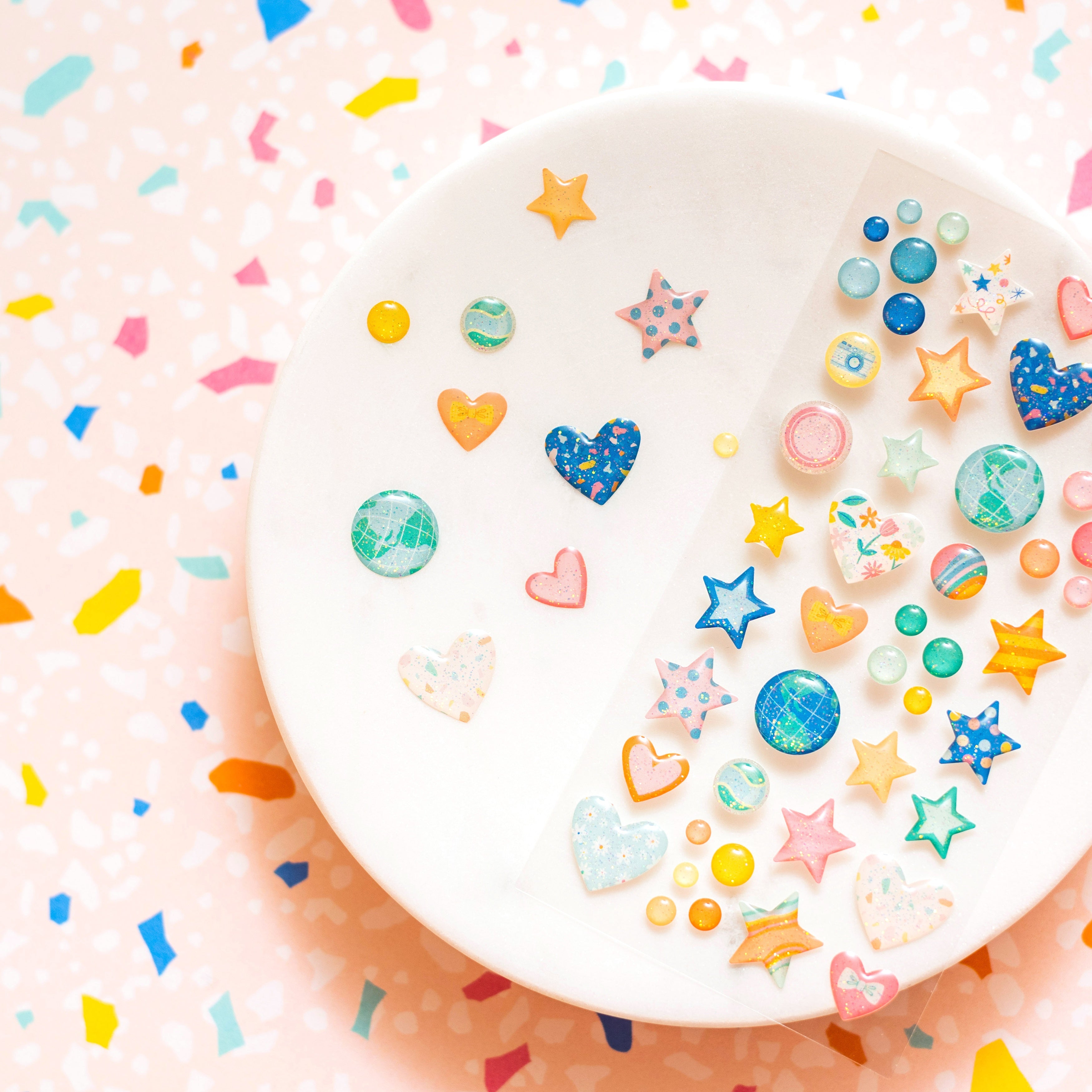 Add a bit of dimension and color to your projects with these adorable enamel stickers from Obed Marshall! They come in a variety of bright colors and cute designs to customize your planners, journals, cards, scrapbooks and more. This package includes 48 enamel stickers in a variety of colors and designs.