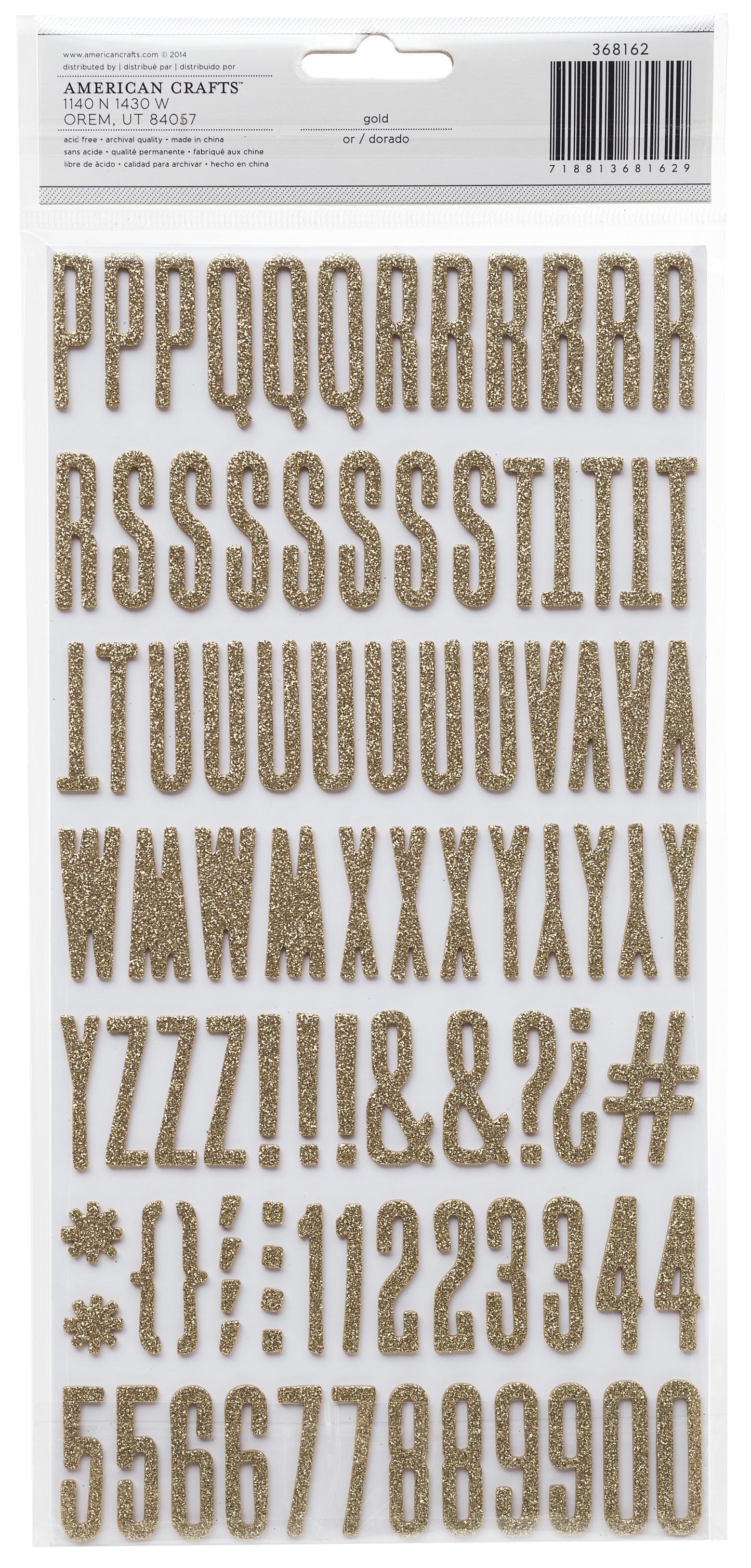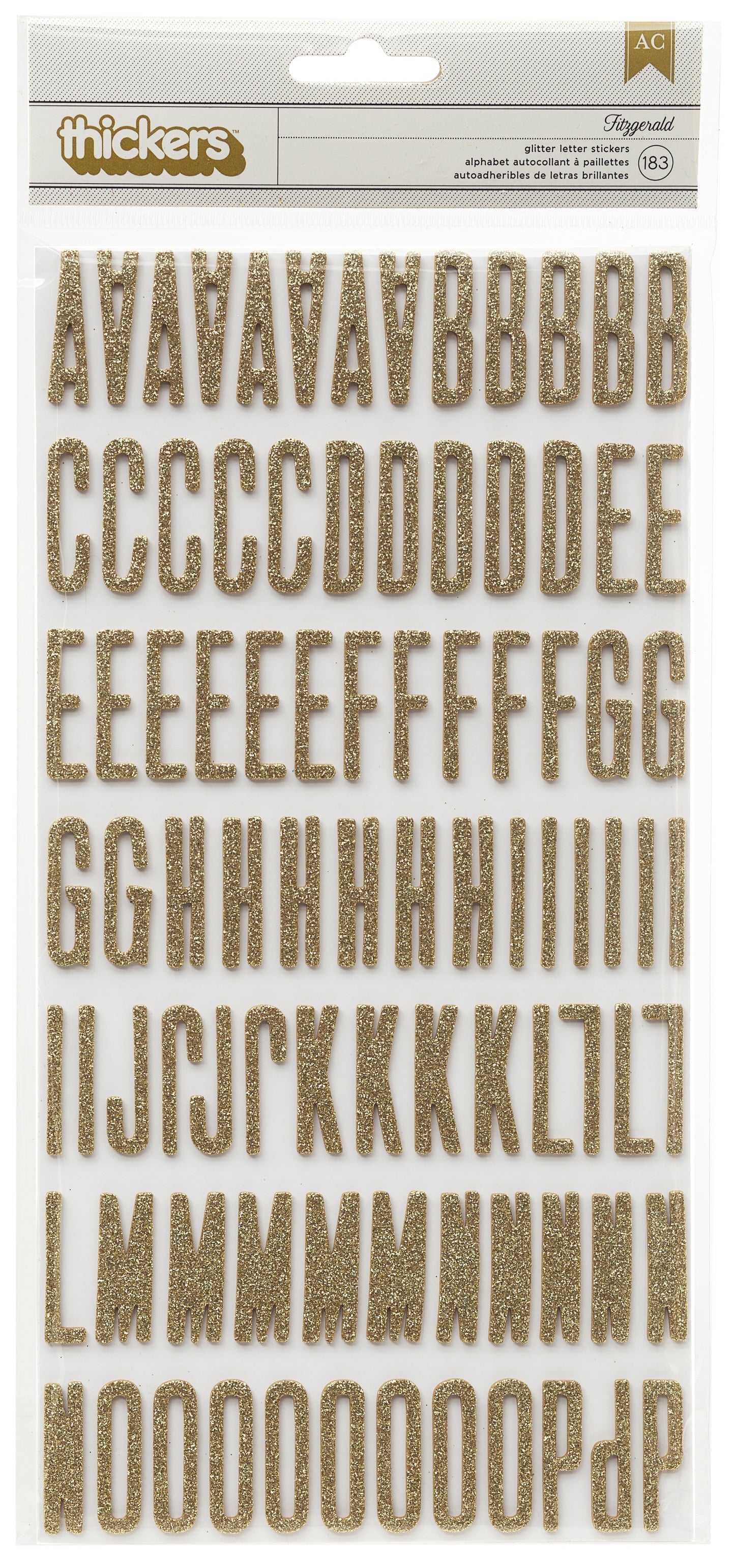 Stickers add the perfect finishing touch to your paper projects. Stickers can be a fun embellishment, a whimsical accent or add elegant polish to scrapbook pages, greeting cards, mixed media and more. This package contains American Crafts Thickers Stickers - Alphabet, Fitzgerald, Gold Glitter, 183 stickers. Imported.