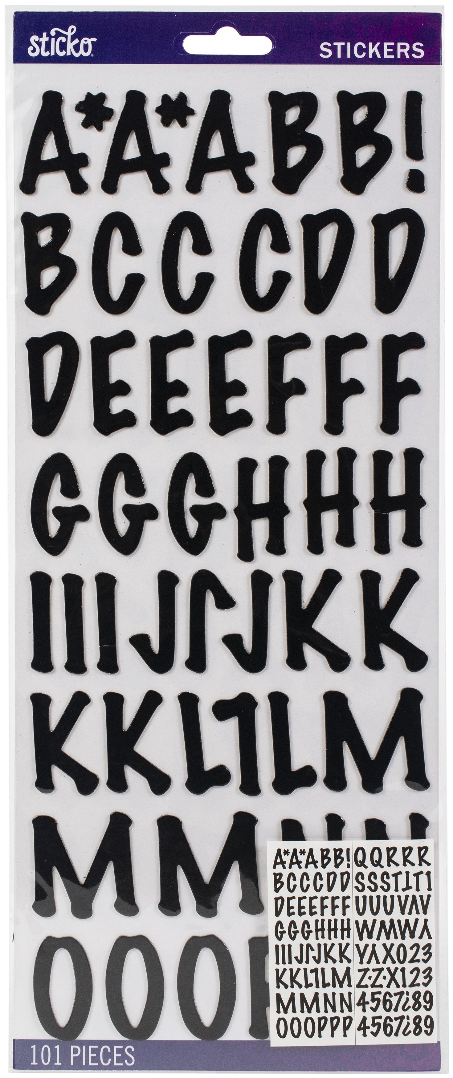 Sticko stickers are ideal for embellishing cards, scrapbook pages, craft projects and much more. This package contains 101 alphabet stickers on two 5.75x13.5 inch backing sheets. Imported.