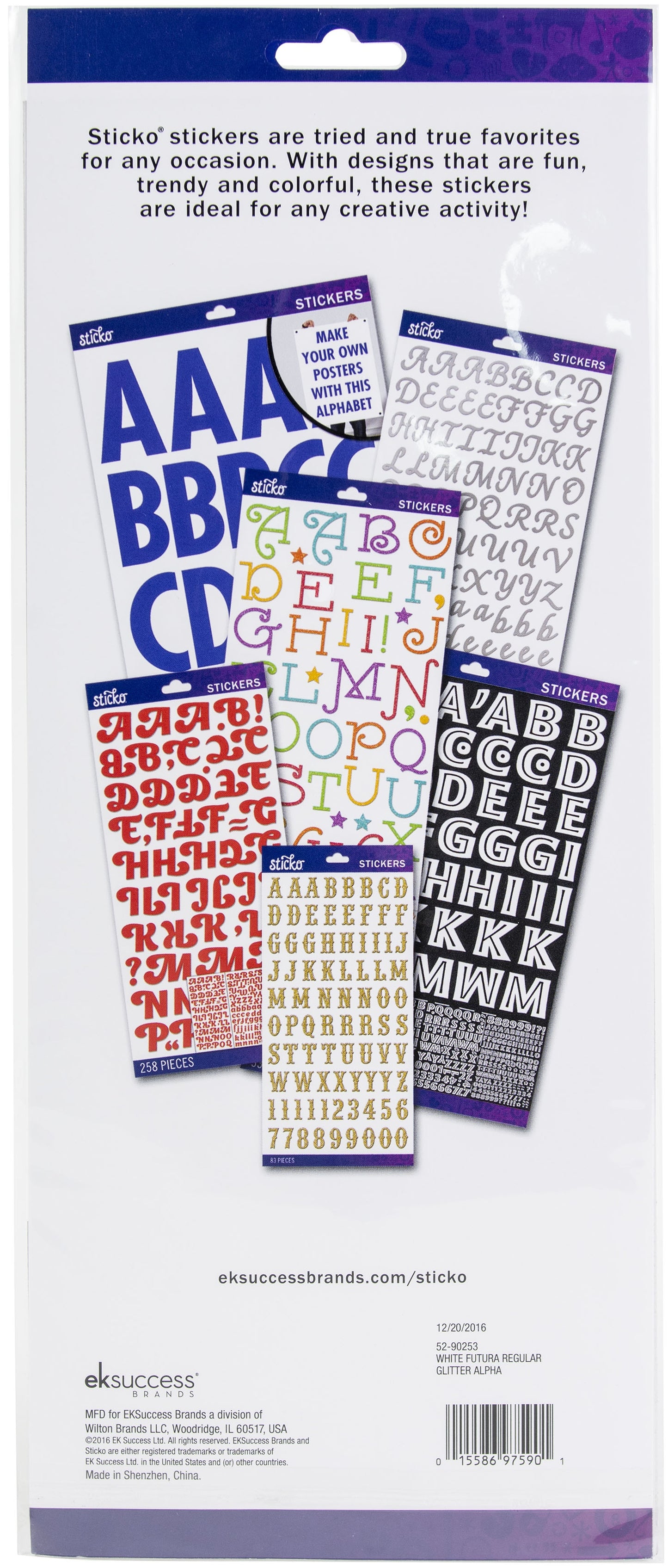 Stickers add the perfect finishing touch to your paper projects. Stickers can be a fun embellishment, a whimsical accent or add elegant polish to scrapbook pages, greeting cards, mixed media and more. This package contains Sticko Alphabet Stickers - Futura, White Glitter, 112 pieces. Imported.