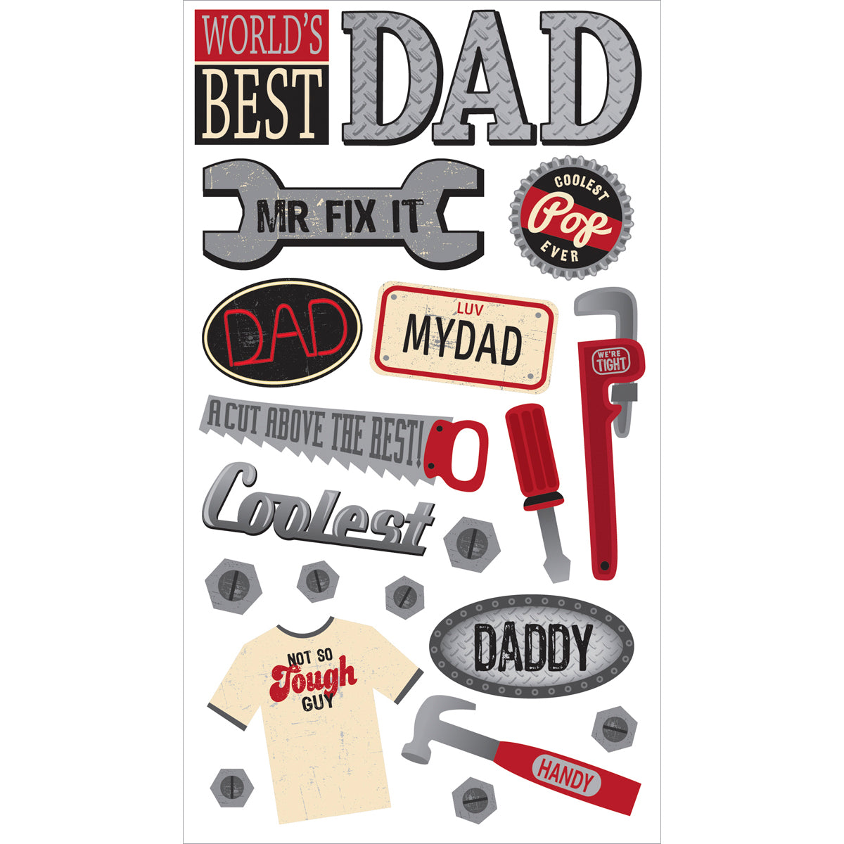 Stickers add the perfect finishing touch to your paper projects. Stickers can be a fun embellishment, a whimsical accent or add elegant polish to scrapbook pages, greeting cards, mixed media and more. This package contains Sticko Stickers - Fix It Dad, 22 pieces. Imported.