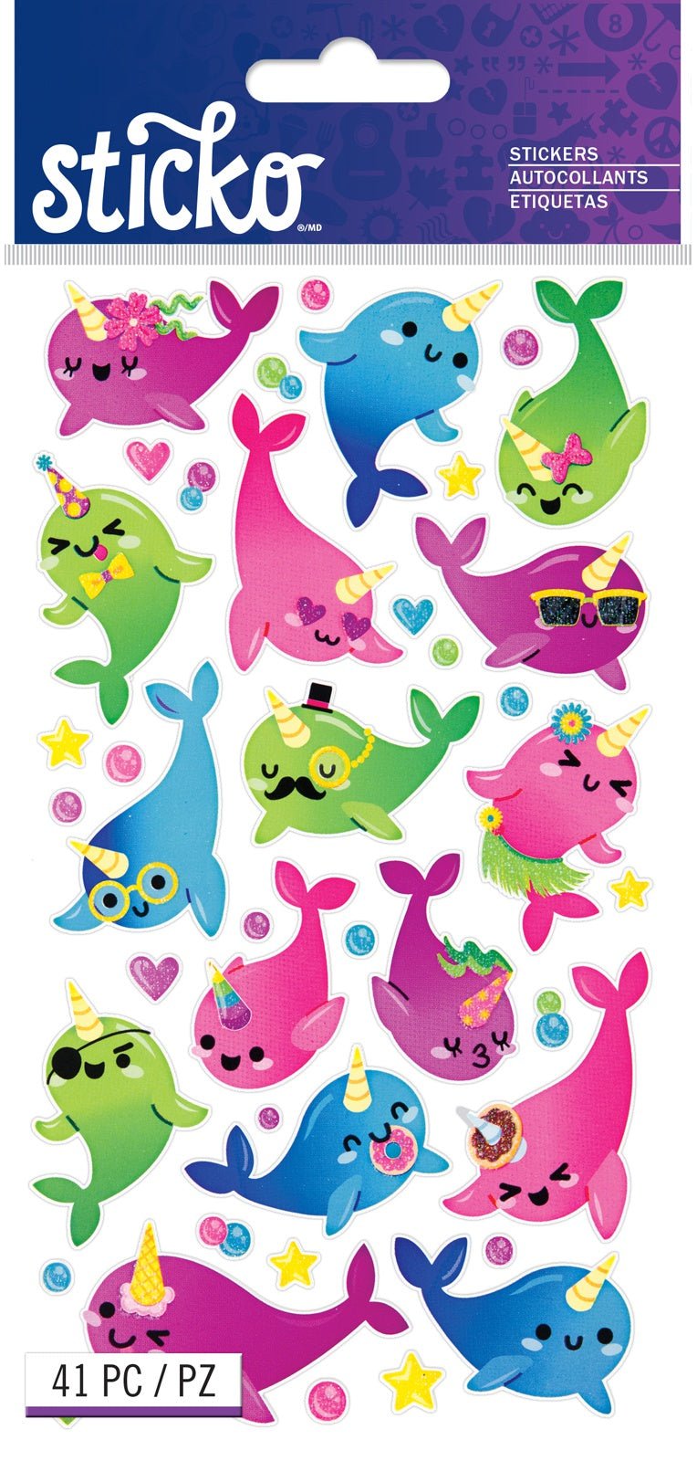 Stickers add the perfect finishing touch to your paper projects. Stickers can be a fun embellishment, a whimsical accent or add elegant polish to scrapbook pages, greeting cards, mixed media and more. This package contains Sticko Stickers - Funny Narwhals, 41 pieces. Imported.