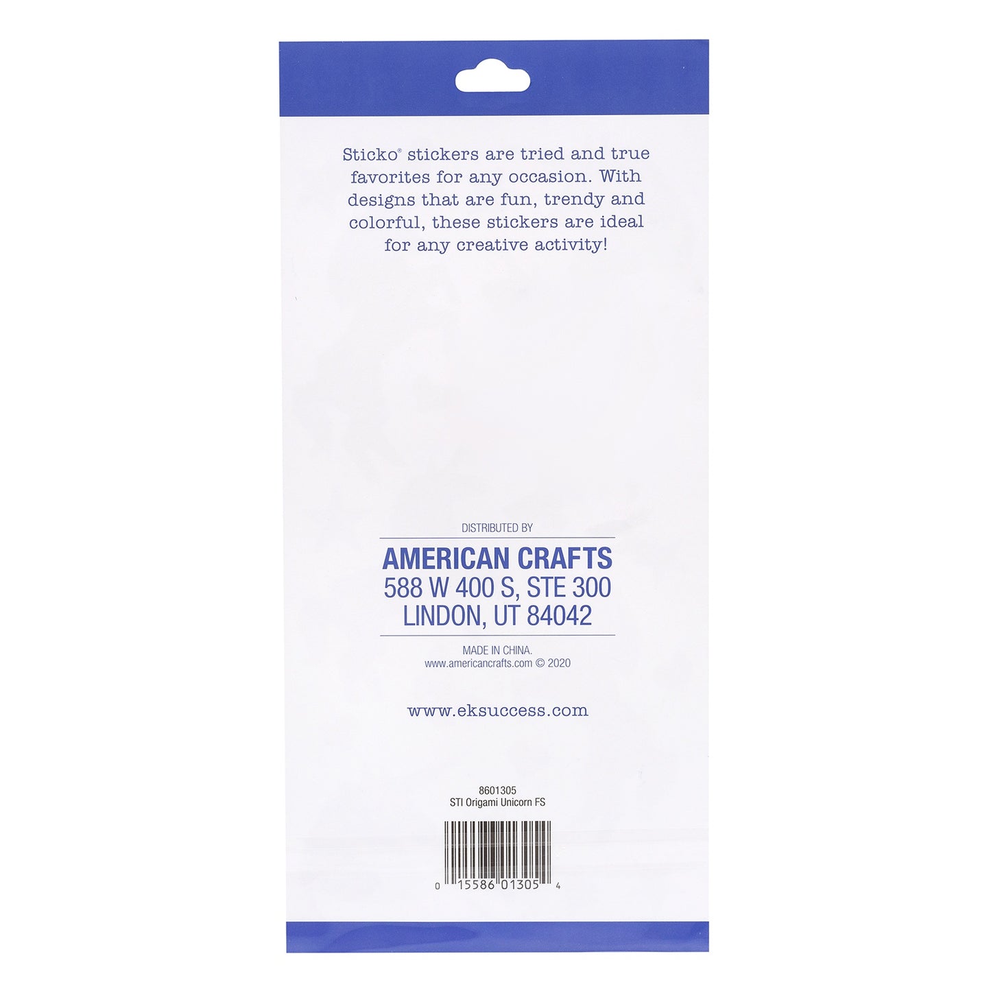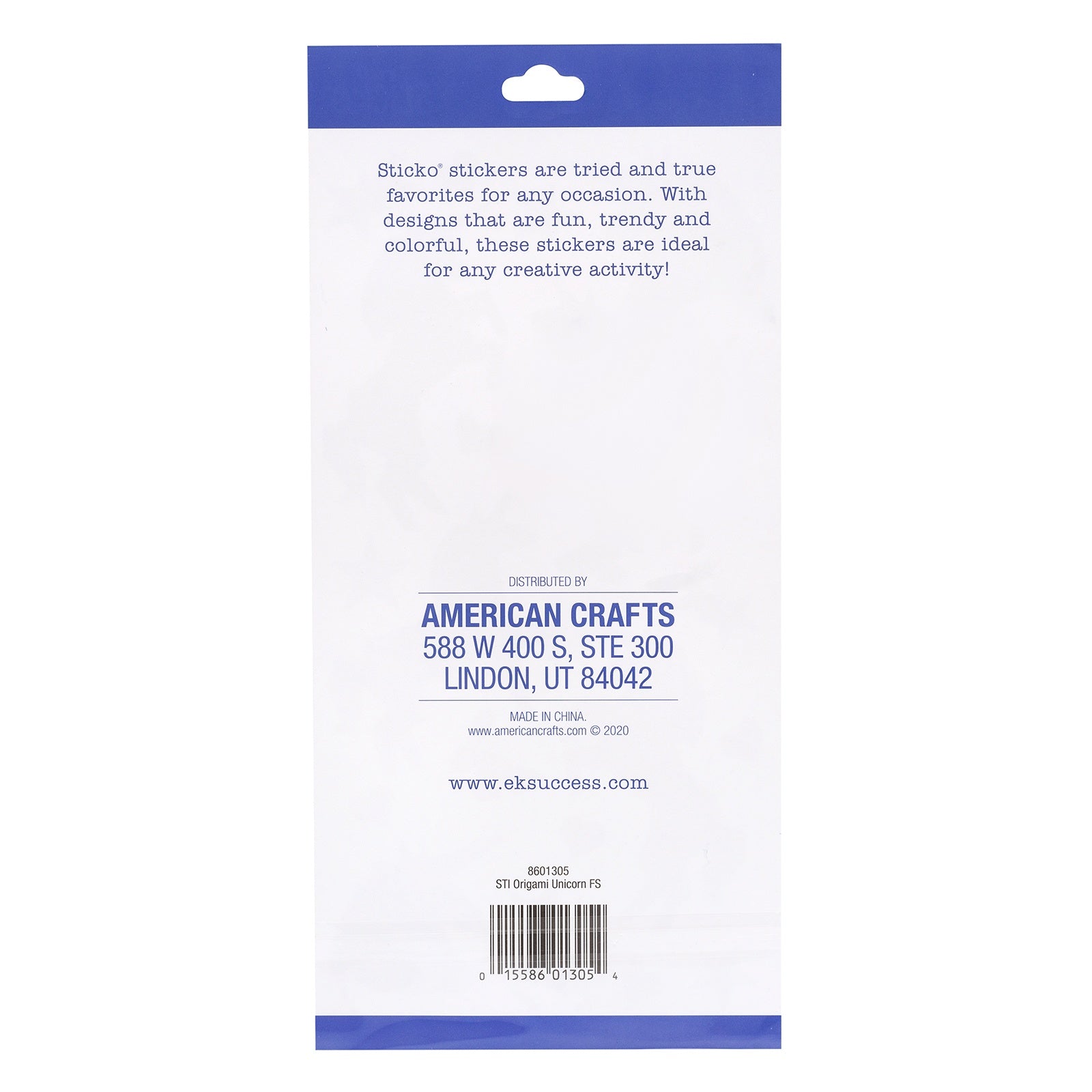 Stickers add the perfect finishing touch to your paper projects. They can be a fun embellishment, a whimsical accent or an elegant polish to scrapbook pages, greeting cards, mixed media and more. This package contains Sticko Themed Stickers - Origami Unicorn, 21 pieces. Imported.