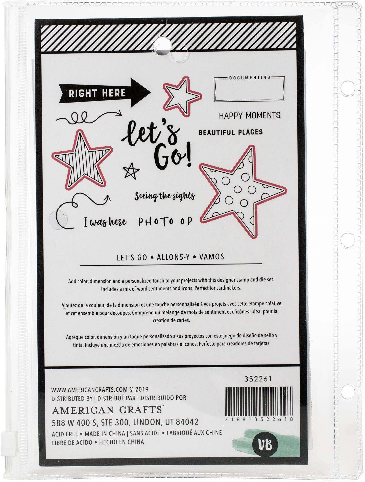 Add color, dimension and a personalized touch to your projects with this designer stamp and die set! Perfect for cardmakers. This package contains Lets Go: 14 clear stamps on one 5.25x6.5 inch backing sheet and three dies measuring between 1.125x1.125 inches and 2.5x2.5 inches. Acid free. Imported.
