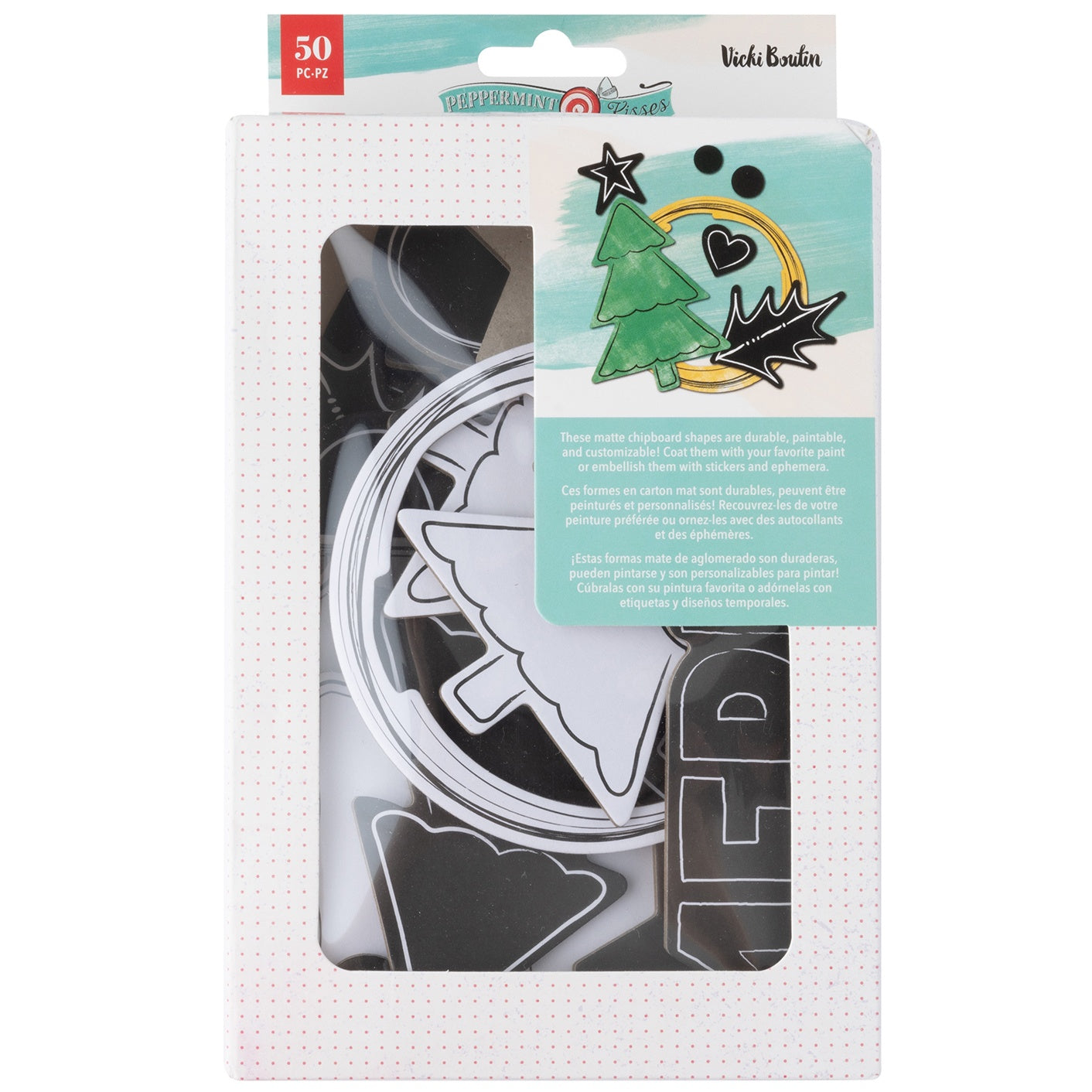 Capture the sweet joy of the season with Peppermint Kisses by Vicki Boutin. You can almost smell the soothing, aromatic, and nostalgic scent of candy canes and gingerbread coming from this lovely collection. Open it up and you'll find a color palette that's oh-so-merry and bright, and a haul of charming stickers, ephemera, and mixed media pieces that embody the magic of the holidays. Add your favorite photos and memories form years past and today, and plant sweet Peppermint Kisses across the pages of scrapbooks, cards, and more. Add unique chipboard pieces to projects for an extra special touch. They're great for adding color and style! This package includes 50 pieces that are great for journals, planners, and more. They're particularly perfect for larger layouts and mixed media. use them as-is or layer for a little dimension.