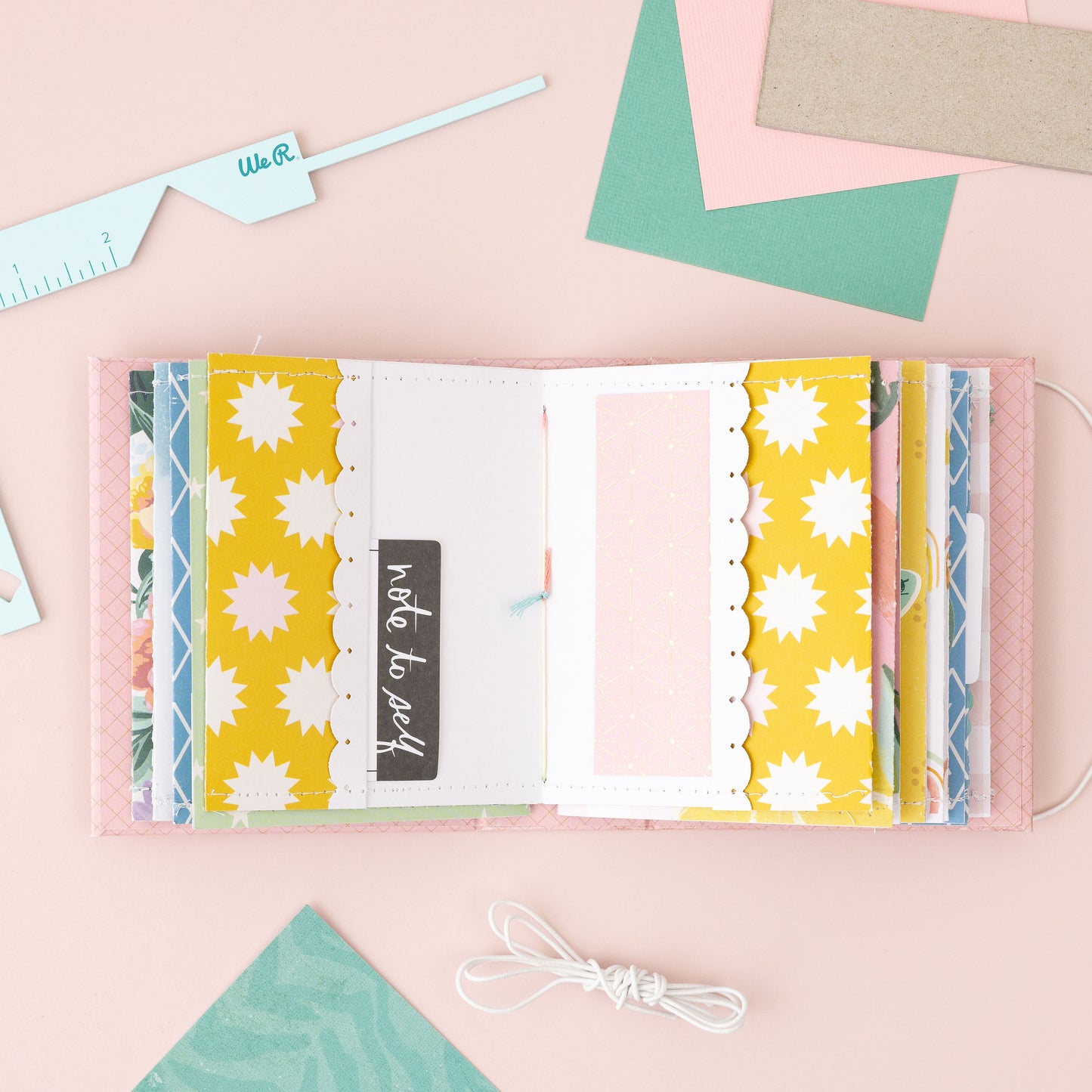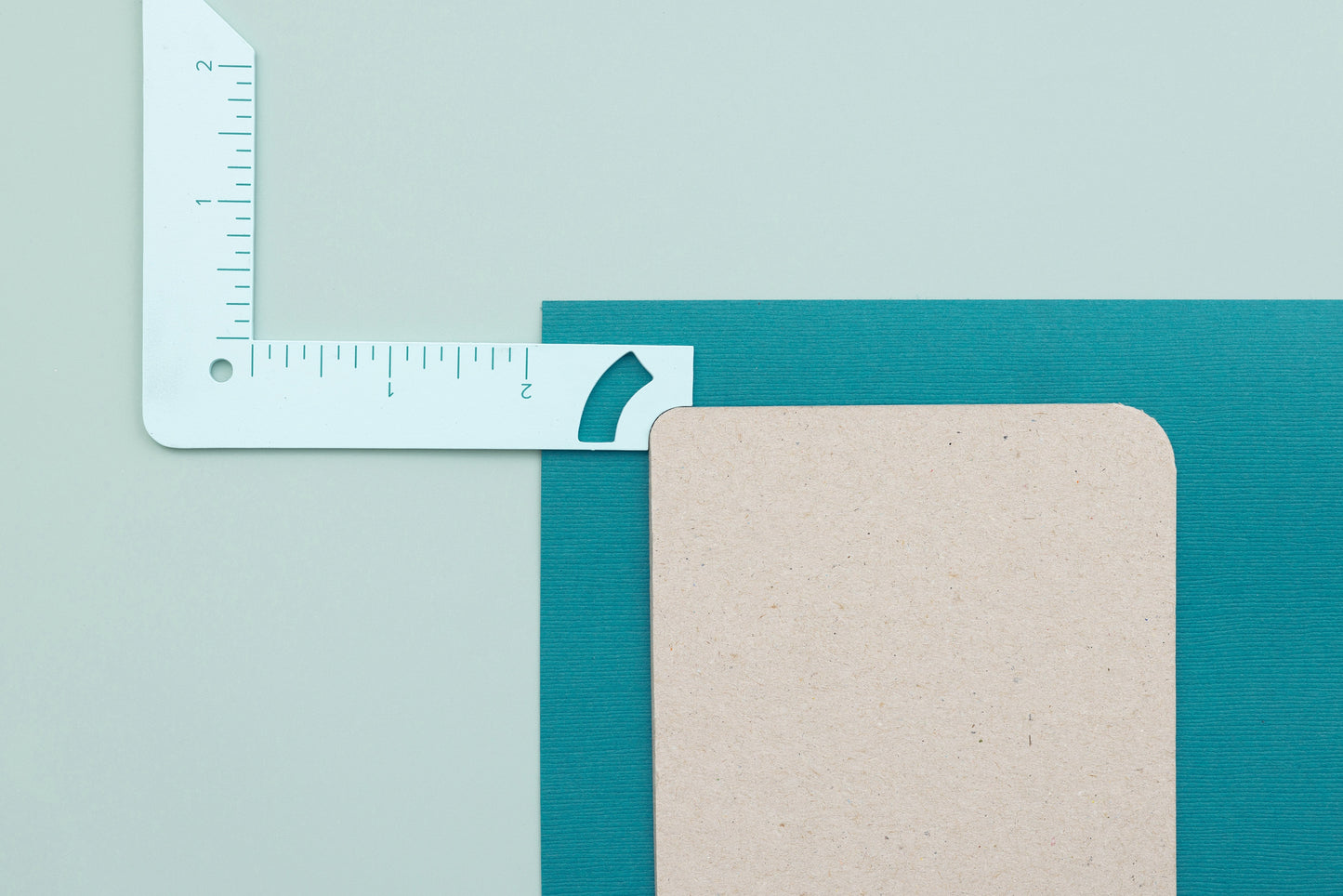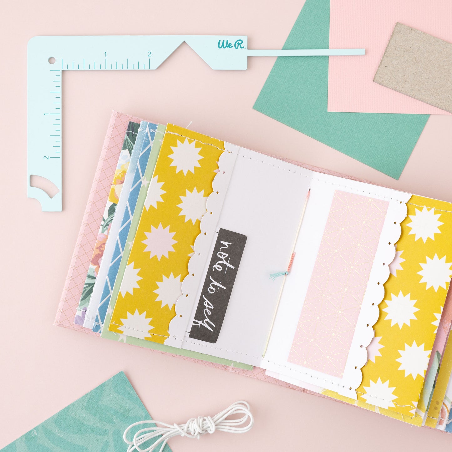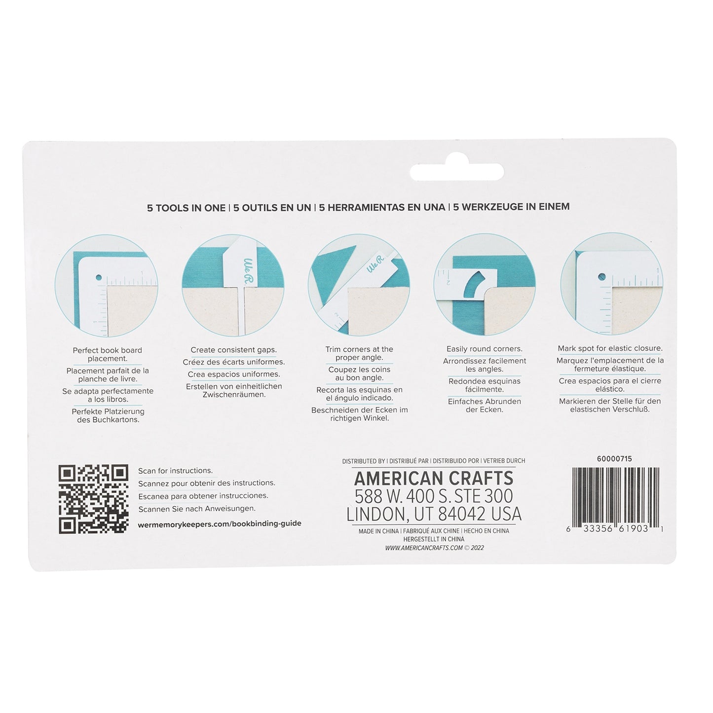 Easily make book covers with this all-in-one guide. It's five tools in one! This durable metal book cover guide features perfect book board placement, consistent gaps, trim corners at the proper angle, easily round corners and mark spot for elastic closure. It also includes a scan code for detailed instructions. This package contains one We R Book Cover Guide - Mint. Imported.