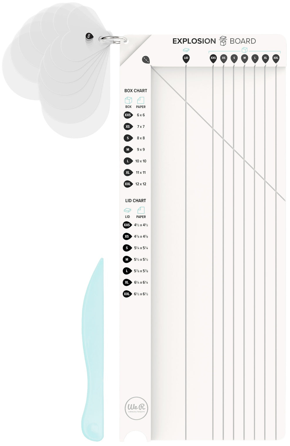 Create colorful kabooms of brightness and fun with the Explosion Board by We R Makers! This handy tools lets you make explosion boxes for fun and dynamic memory keeping, gift giving, and more. It features guides and measurements to help you create boxes and lids in 7 nesting sizes, and 7 heart templates for decorative corner details. Make additional cards, pockets, and inserts to decorate the box panels, then add your photos, stickers, and washi tape, and your next project will be DIY-namite! This package includes one Explosion Board.