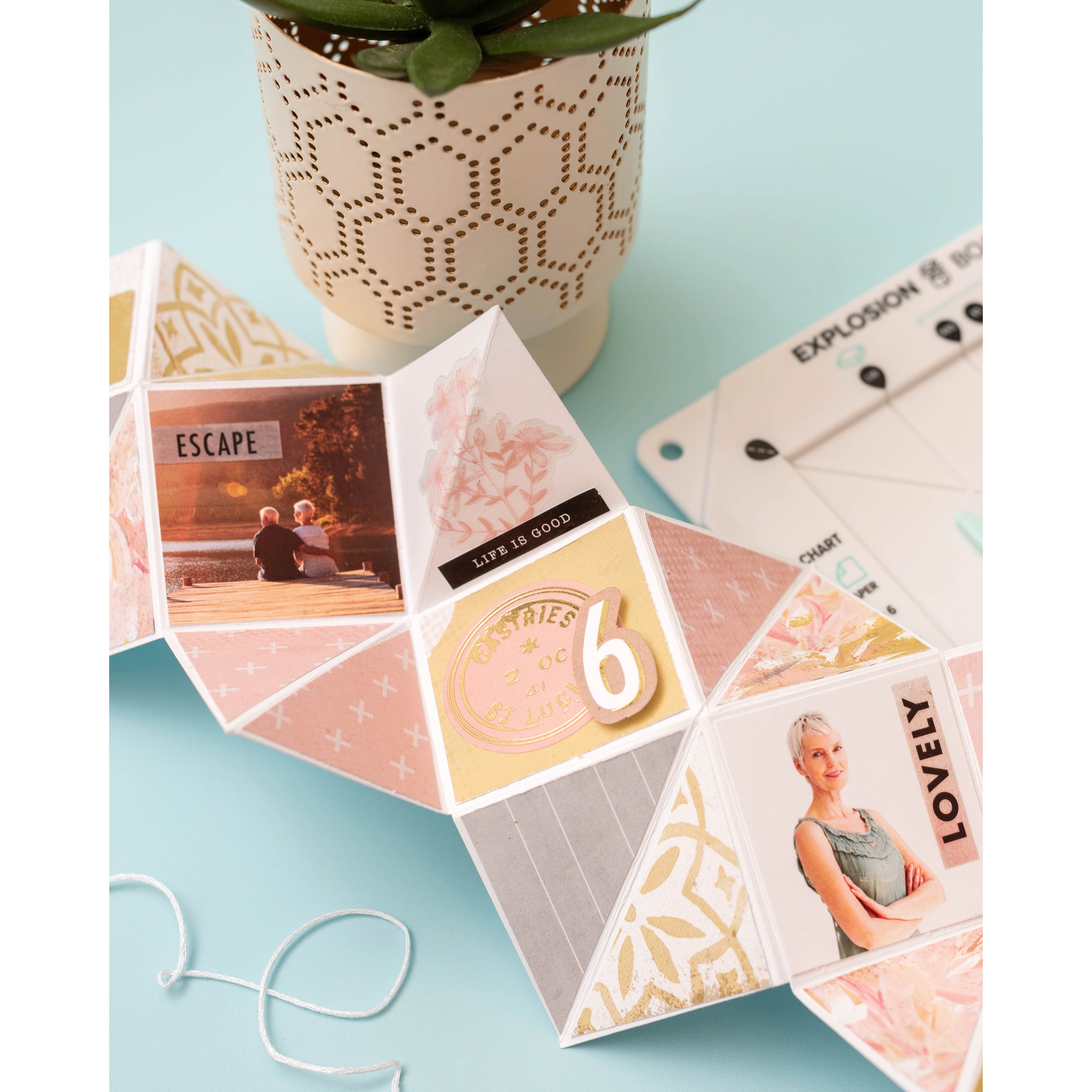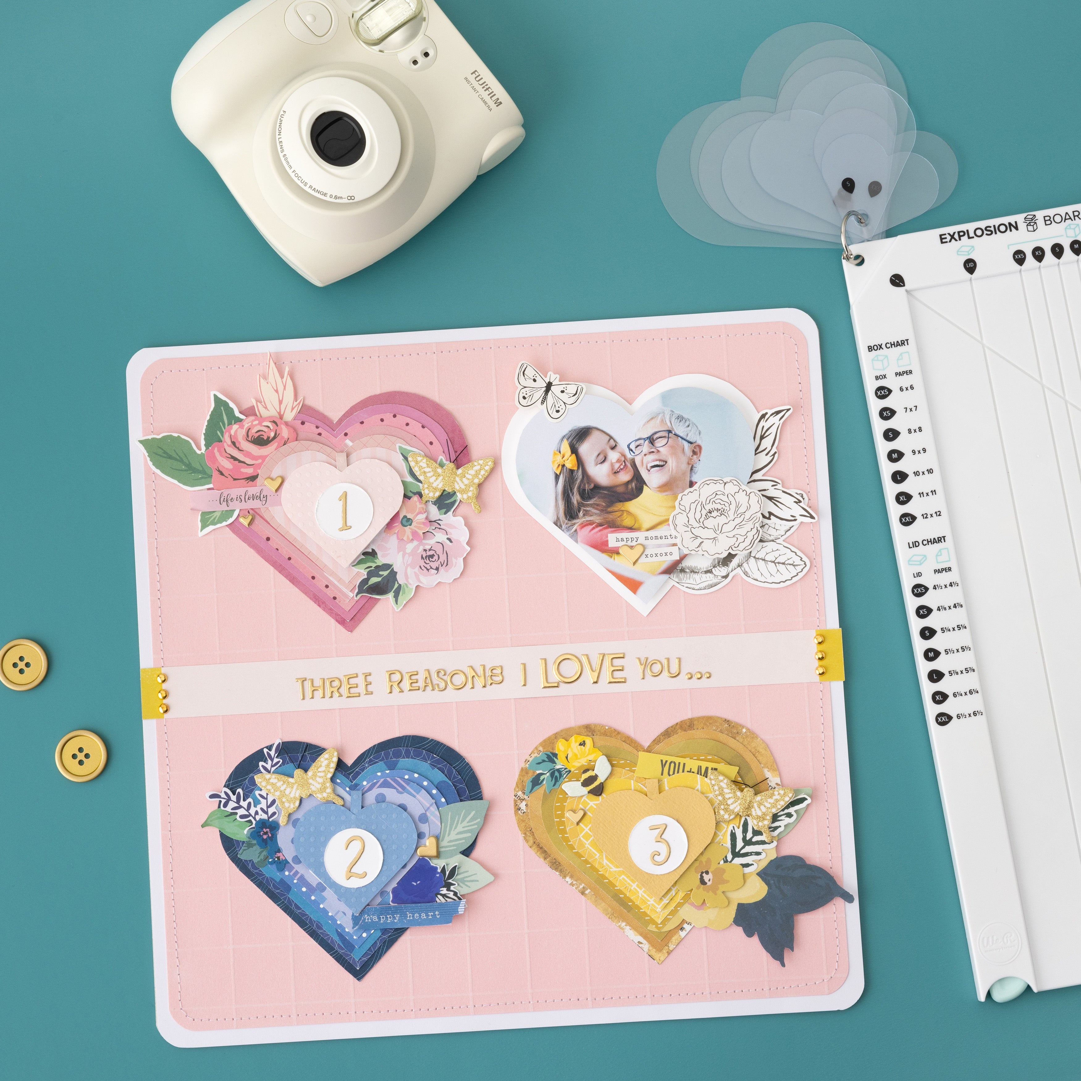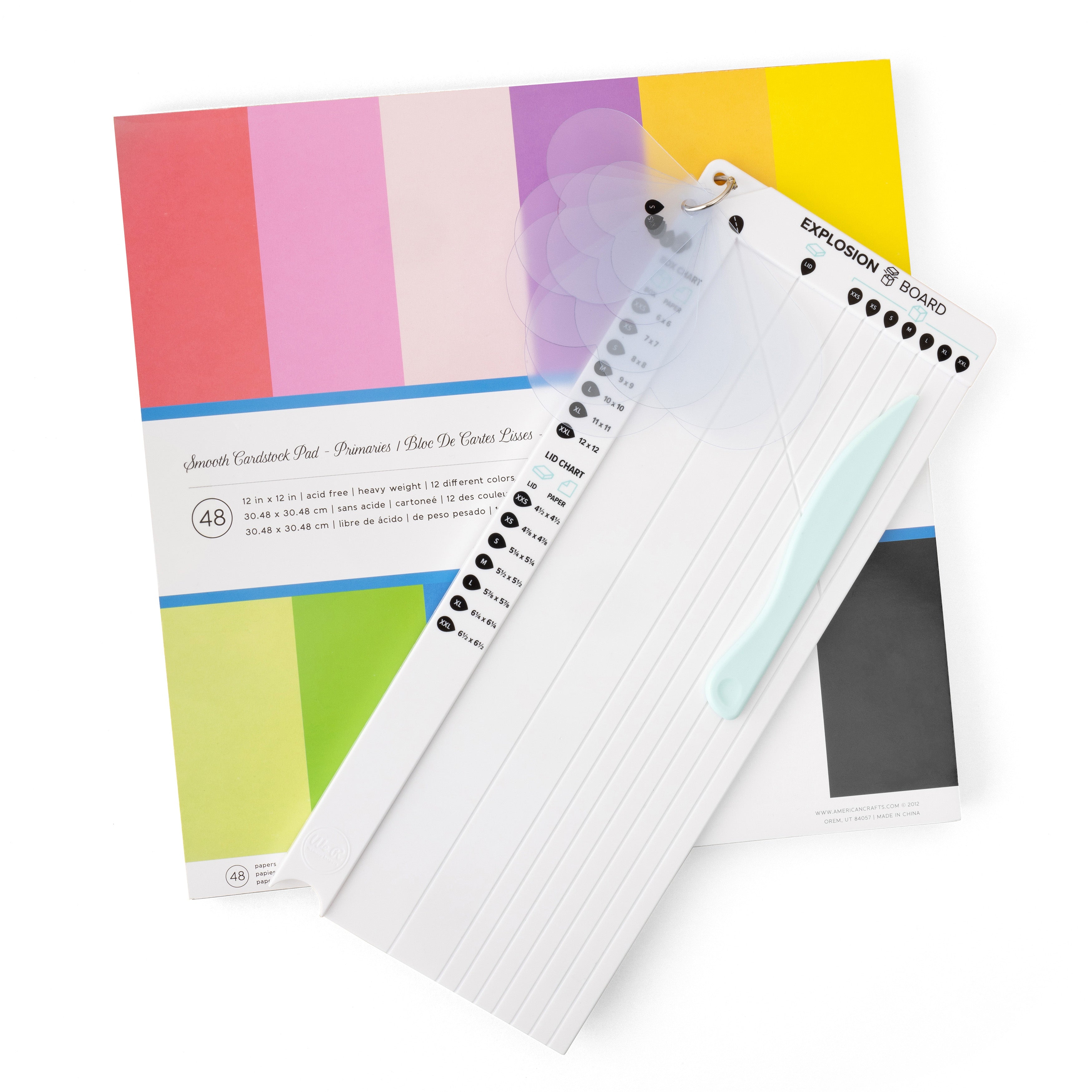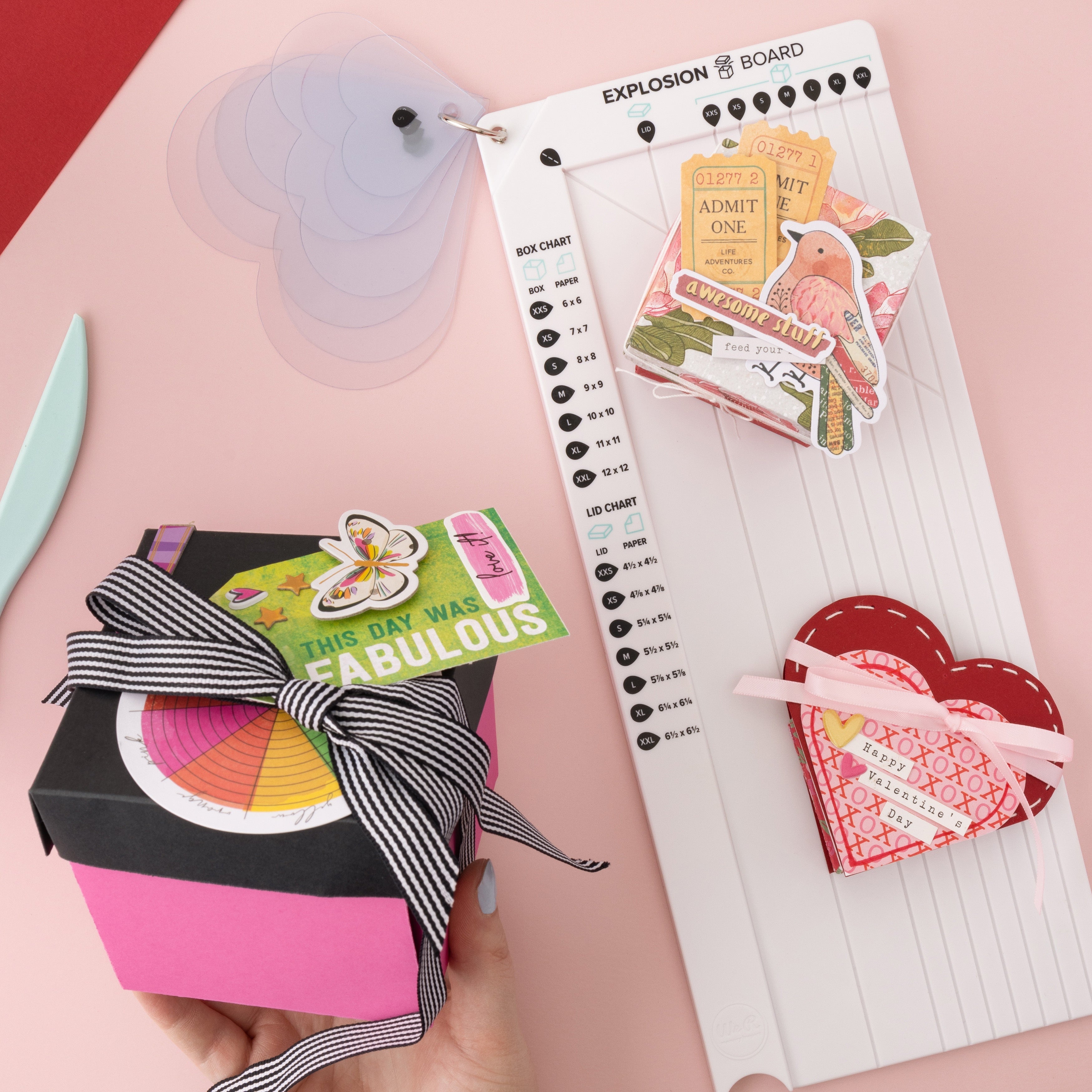 Create colorful kabooms of brightness and fun with the Explosion Board by We R Makers! This handy tools lets you make explosion boxes for fun and dynamic memory keeping, gift giving, and more. It features guides and measurements to help you create boxes and lids in 7 nesting sizes, and 7 heart templates for decorative corner details. Make additional cards, pockets, and inserts to decorate the box panels, then add your photos, stickers, and washi tape, and your next project will be DIY-namite! This package includes one Explosion Board.
