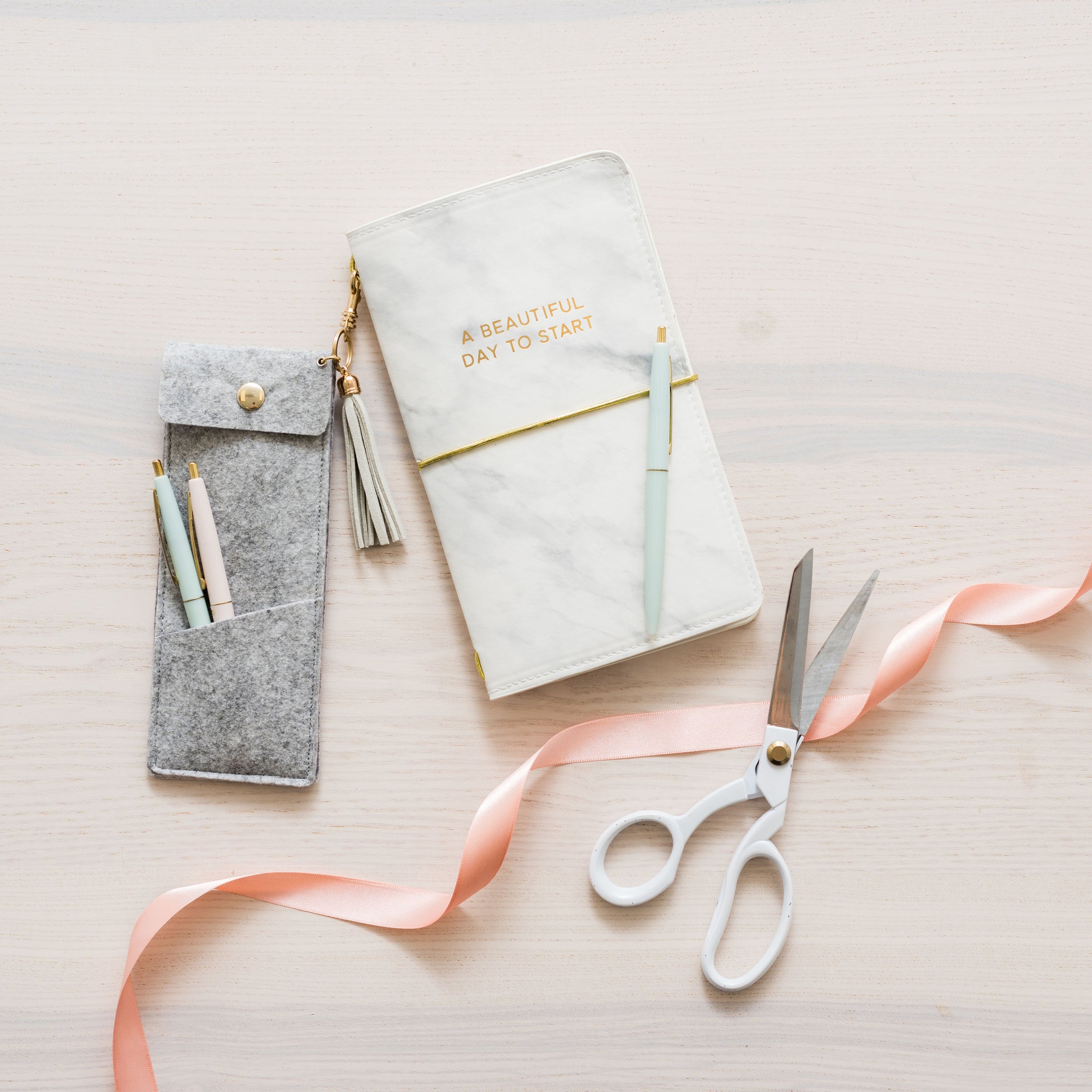 Keep all of your belonging safe in this fashionable case. This 3.75x9.25 inch package contains one felt journal case with a snap pocket, front pocket, tassel and clip. Fits up to 5 pens/pencils. Clips to any size journal. Imported.