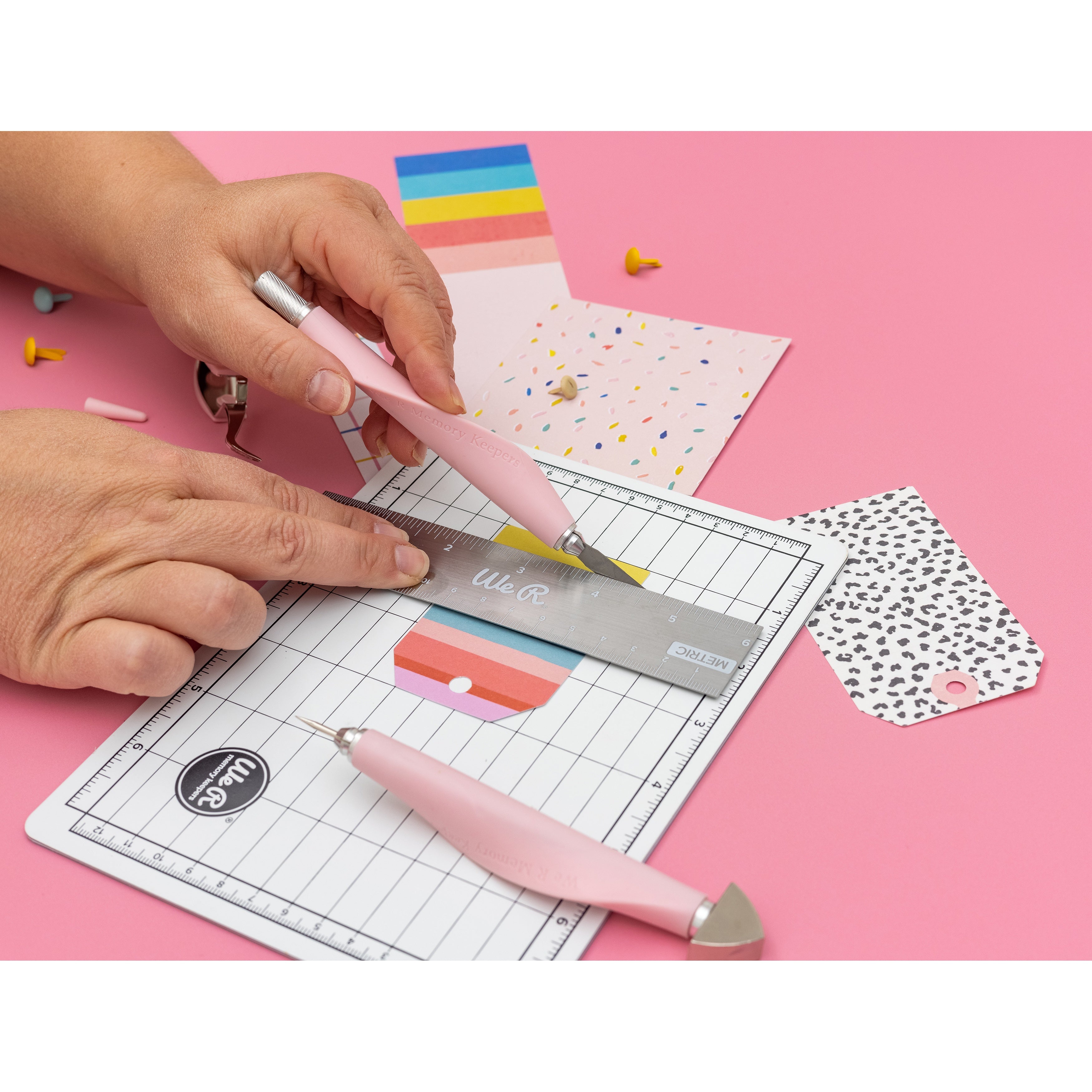 - Comprehensive Set: Includes cutting mat, ruler, scissors, craft knife, tweezers, brad setter, and piercing tool.