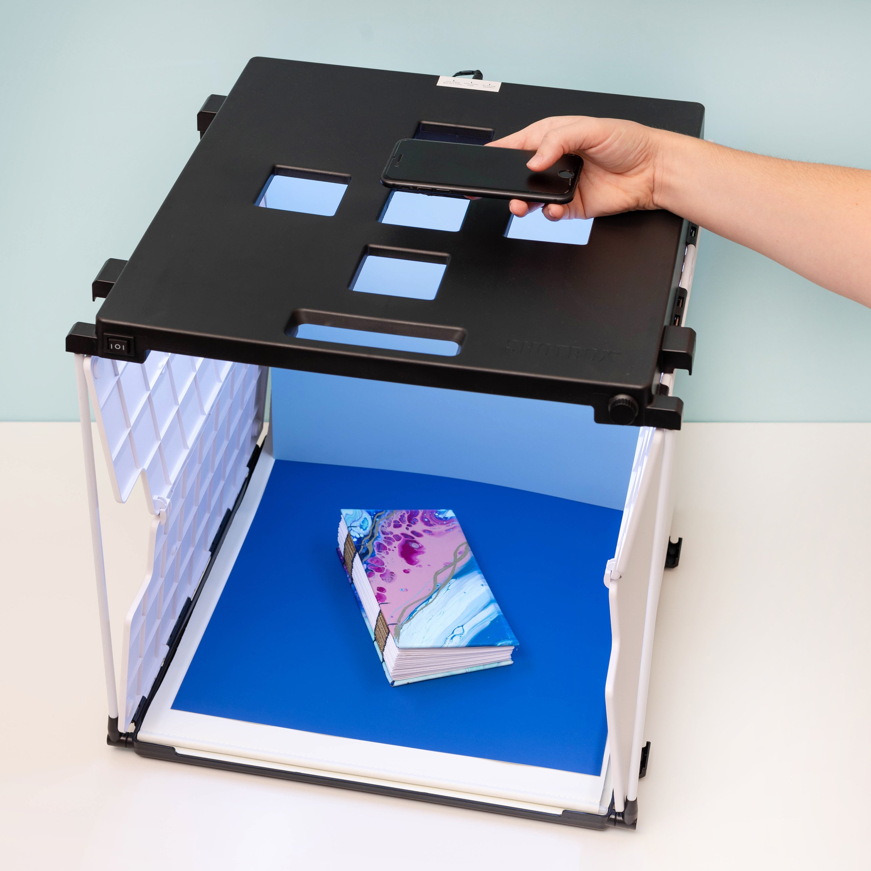 Create professional level content at home with the Shotbox by We R Memory Keepers! This portable photo studio is just the thing to style shots, process videos, archive your content, and more. It features built-in studio lights for even coverage, an on/off dimmer switch, glare shields to keep images clean, and a collapsible frame for easy set up, take down, and storage. This package includes 1 portable photo studio, 1 storage bag, 2 infinity backdrop (1 in black and 1 in white). Accessories sold separately.