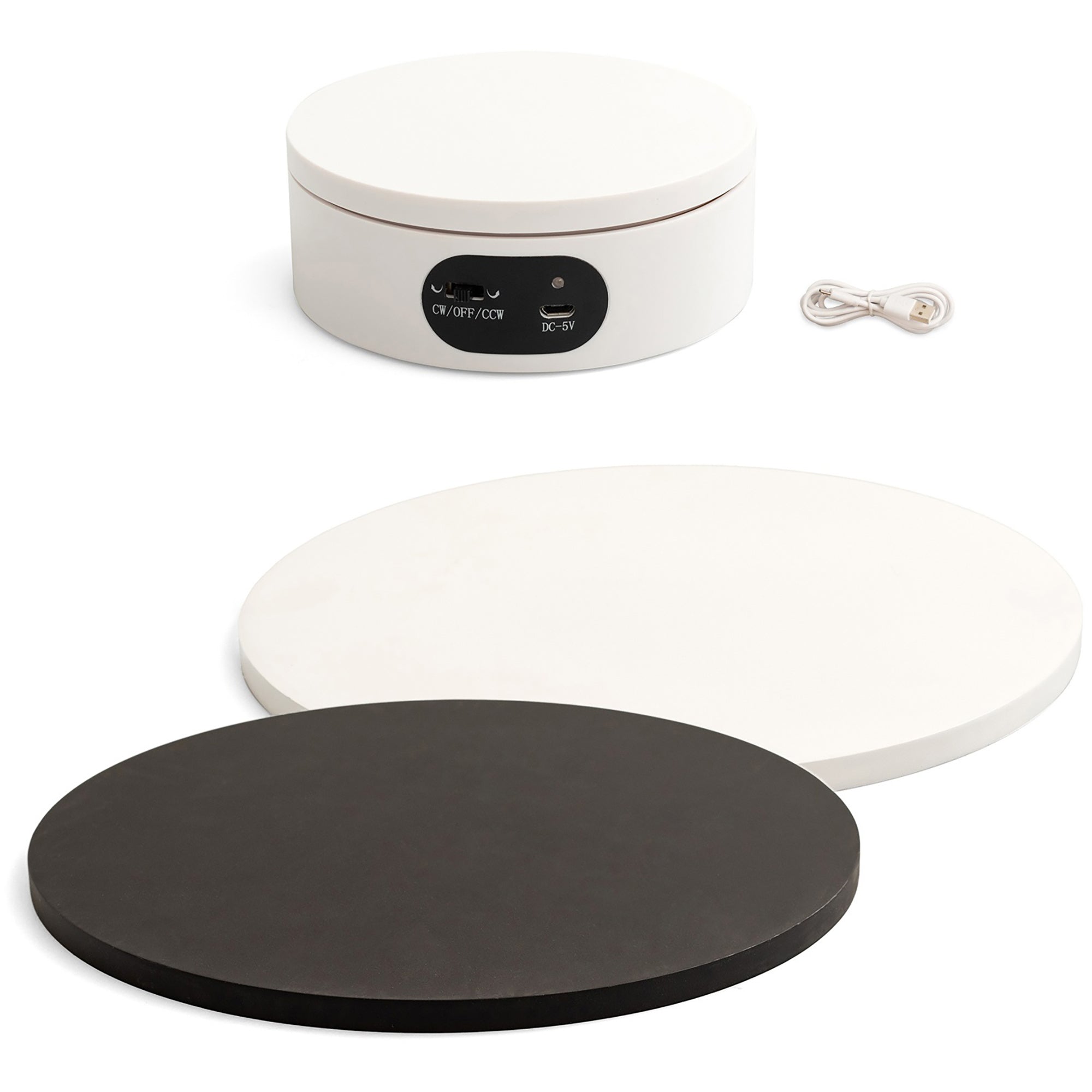 Now you can create professional level content at home with the Shotbox Motorized Turntable. It showcases all angles of your products, making it great for photos and videos. The rotating stand holds up to 15 pounds and can turn right or left. It even fits perfectly inside the Shotbox by We R Makers (sold separately). This package includes one Motorized Turntable measuring 4.75 inches in diameter, one micro USB power cord, and two 8 inch covers. Imported.