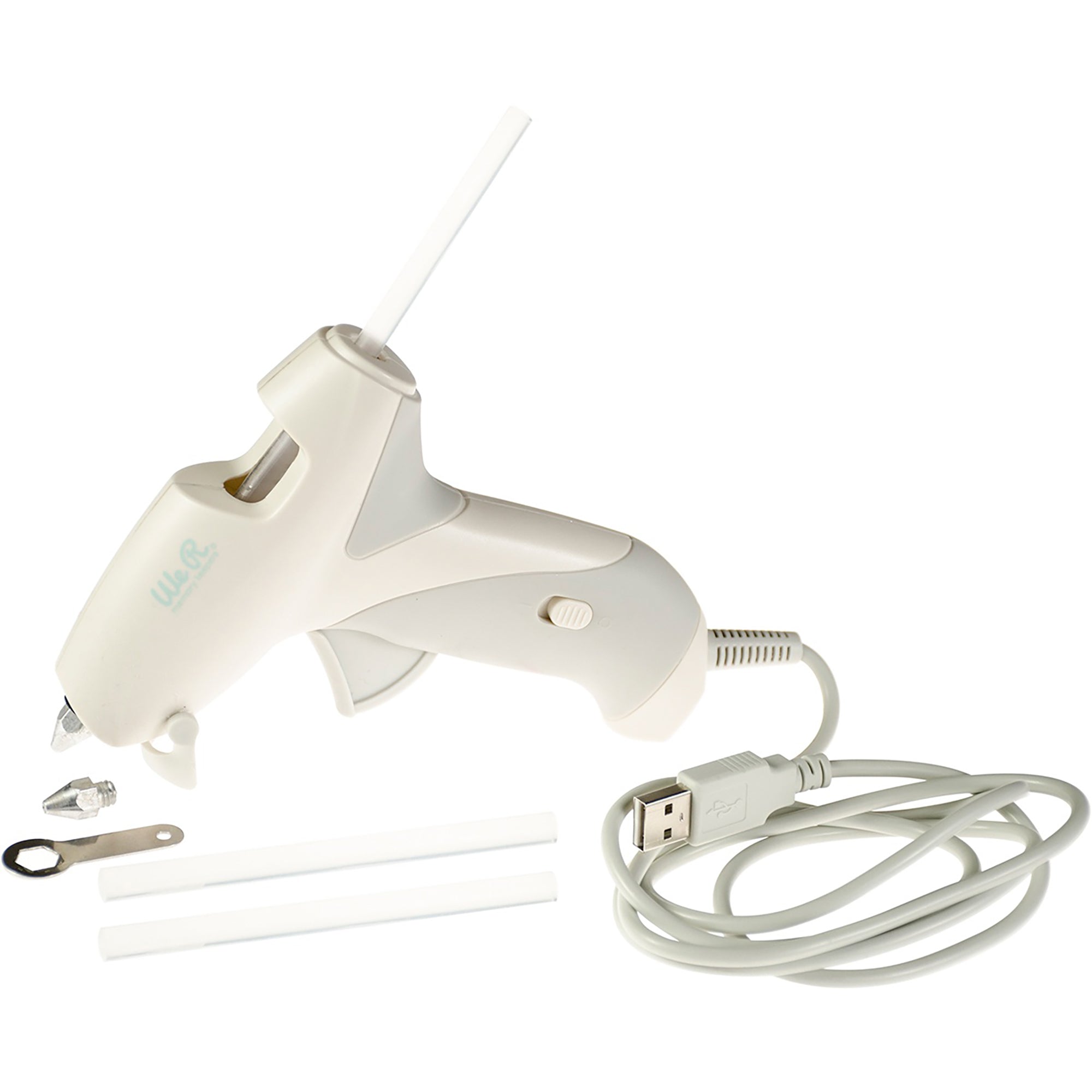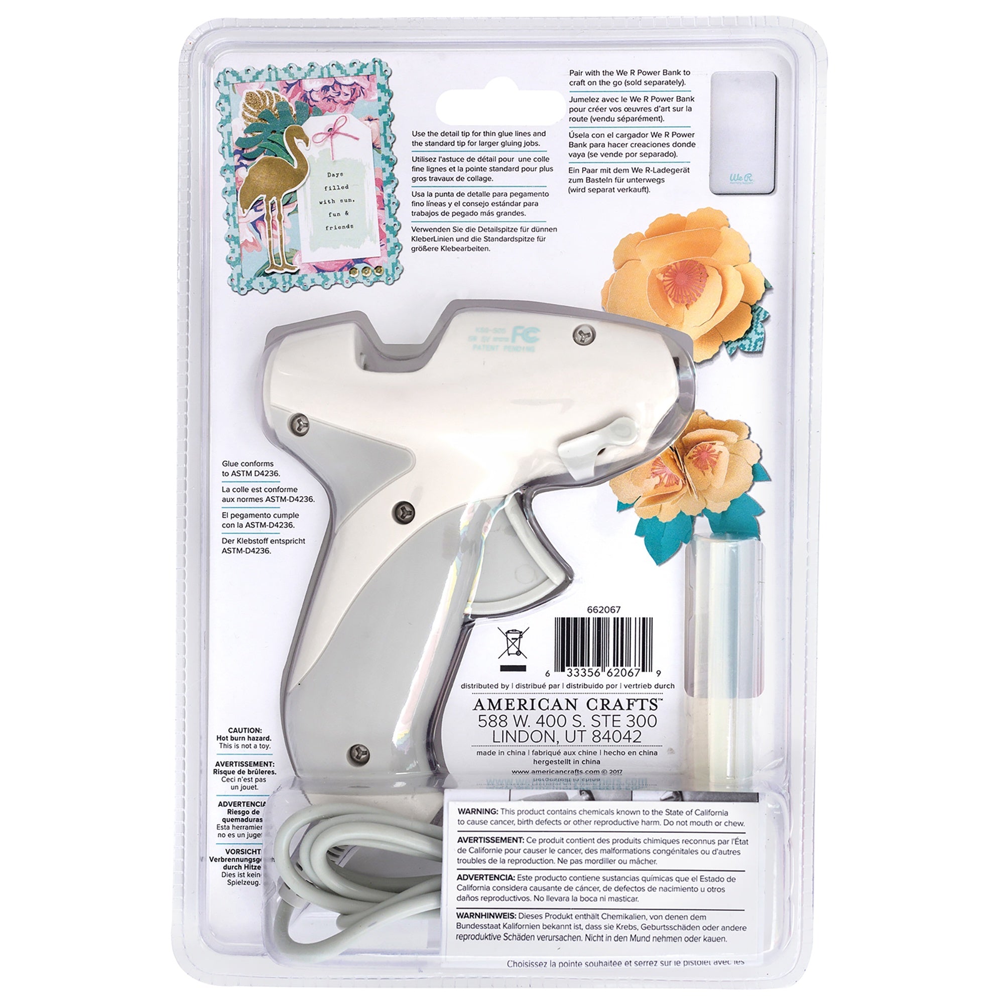 The We R Makers mini glue gun kit is perfect for any crafting project. It includes two tips: use the detail tip for thin glue lines and the standard tip for larger gluing jobs. The USB cord makes it easy for crafting on the go. Package size: 6.5x9x1.75; includes one 5.625x4.25x1.25 inch glue gun with 49 inch USB cord, two tips, small wrench for tips, and three glue sticks. Conforms to ASTM D4236. WARNING: This product contains chemicals known to the state of California to cause cancer, birth defects or other reproductive harm. Do not mouth or chew. CAUTION: HOT BURN HAZARD when in use. For adults only. Imported.