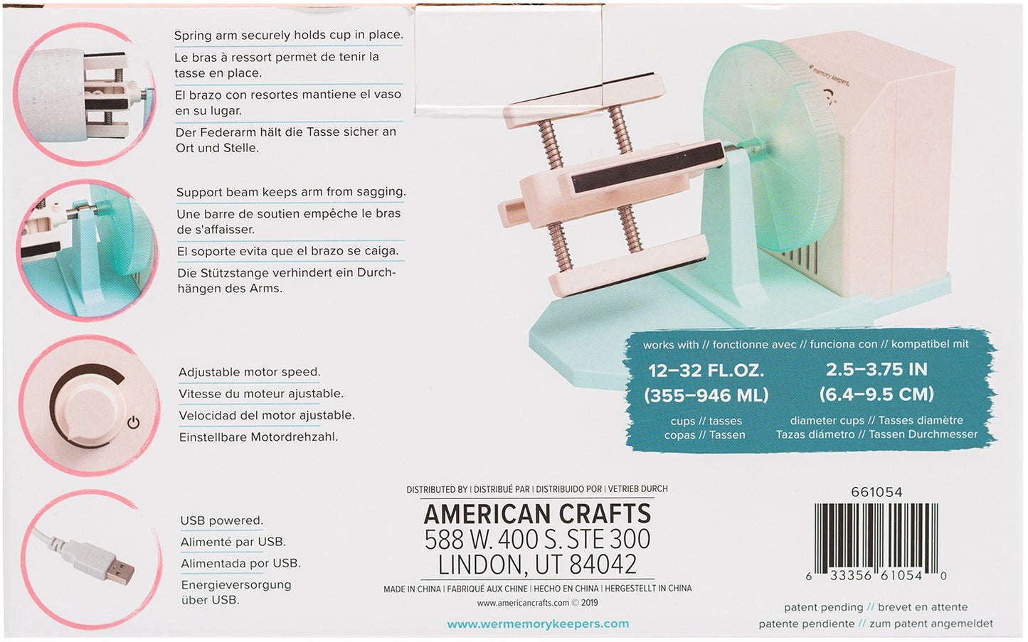 Spring arm holds cups level and securely. Support beam keeps arm from sagging. Ridged disc serves as a way to remove arm with cups still attached and as a base for additional decorating that doesn't require the Spin It(TM) machine. USB powered. Adjustable motor speed. This 5.1x6.3x10 inch package contains one spring arm. Imported.