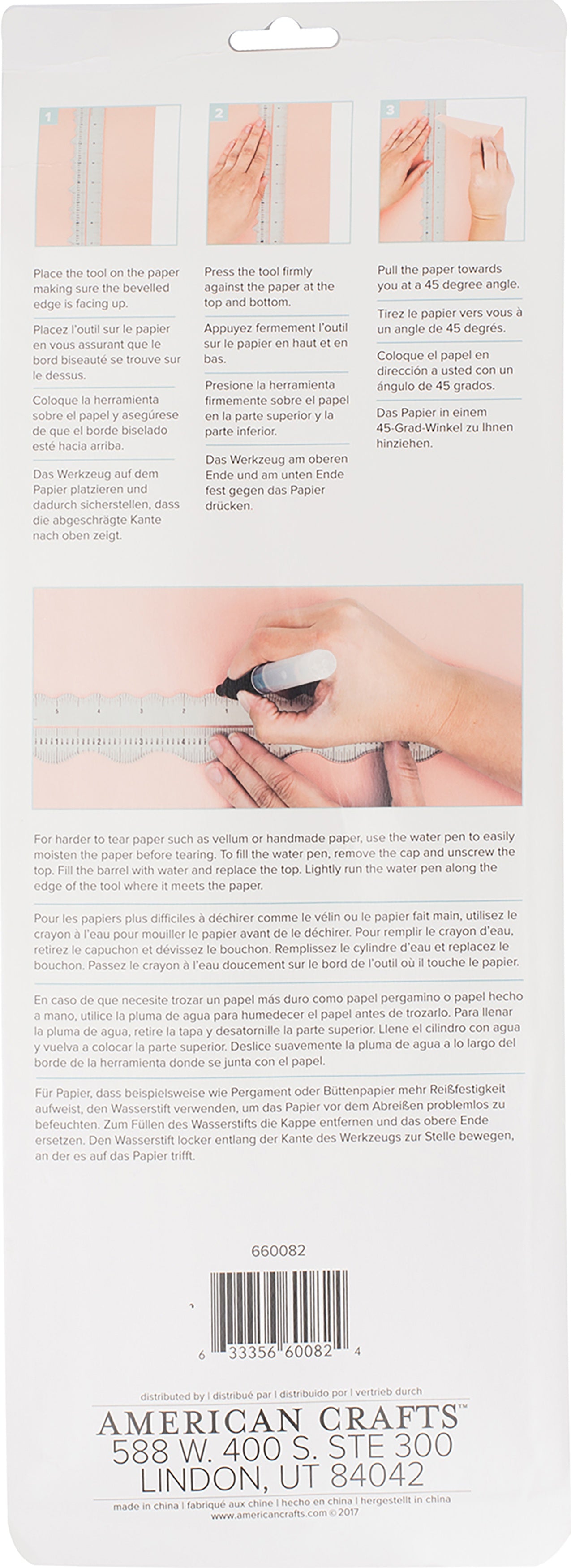Easily tear and deckle paper with the We R Memory Keepers Tear Guides! These guides come in 6 different styles and each accurately measures in 1/16" increments. Their transparent material also allows for easy centering on any style of paper. We've also included a refillable water pen to make tearing thicker paper easier! This package includes 6 tearing guides and one water pen.